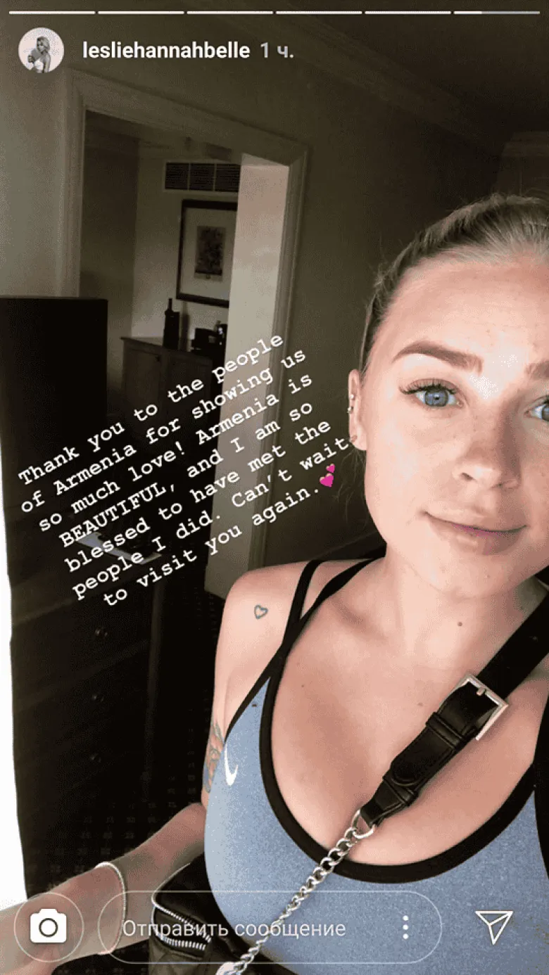 «Հայաստանցիներ, շնորհակալություն սիրո համար: Հայաստանն այնքան գեղեցիկ է եւ իսկական օրհնություն է, որ ես հանդիպեցի այն մարդկանց, որոնց հետ ծանոթացա: Չեմ համբերում, թե հաջորդ անգամ, երբ եմ վերադառնալու», - գրել է Լեսլին: