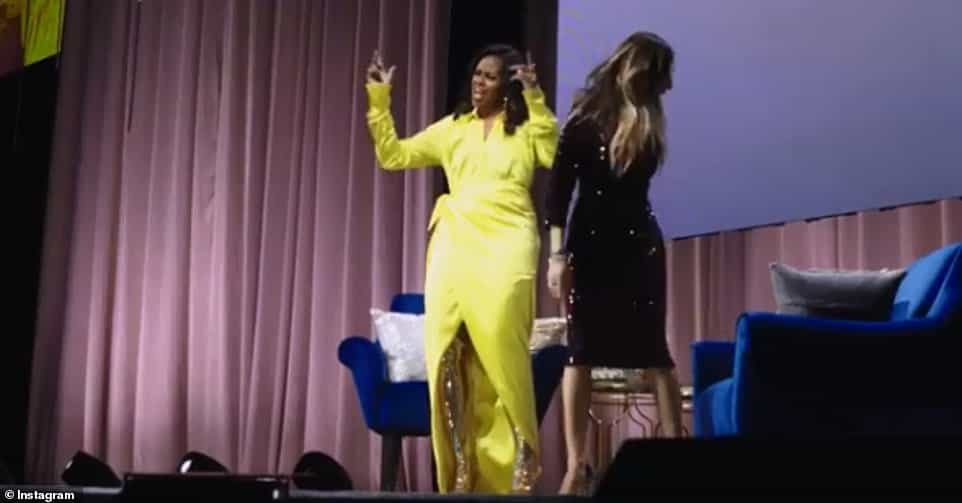 Նախկին առաջին տիկինը, որն այժմ ակտիվորեն գովազդում է իր հուշագրությունը, ներկայացել է Balenciaga ապրանքանիշի առջևից բացվածք ունեցող լիմոնագույն զգեստով: Սակայն հանրության վրա մեծ տպավորություն է թողել նույն ապրանքամիշի փայլուն, մինչև ազդրը հասնող բարձրակրունկ երկարաճիտ կոշիկները: