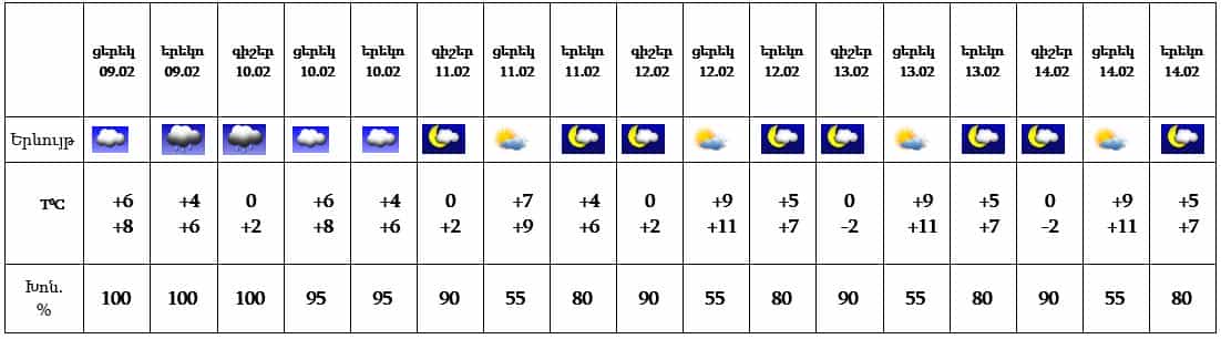 Երևան քաղաքում՝ փետրվարի 9-ի ցերեկը, 10-ին հնարավոր է թույլ անձրև և մառախուղ, 11-14-ին սպասվում է առանց տեղումների եղանակ:
