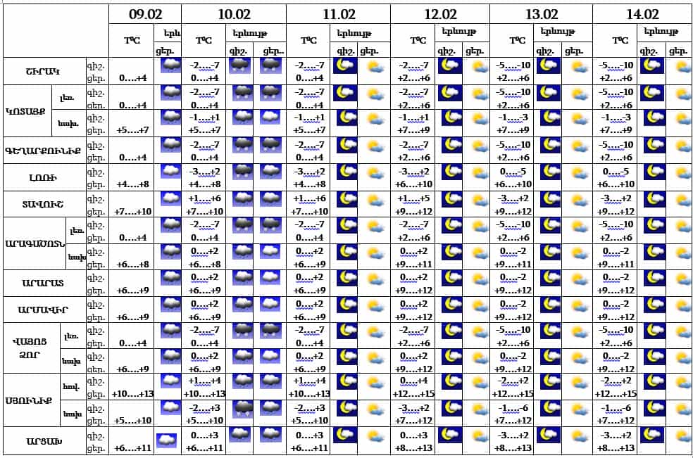 Օդի ջերմաստիճանը փետրվարի 9-ի ցերեկը Լոռիում, Տավուշում, Սյունիքում և Արցախում կնվազի 5-7 աստիճանով: