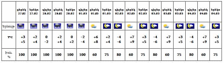 Երևան քաղաքում՝ փետրվարի 27-ի ցերեկը, 28-ին, մարտի 1-ի գիշերը սպասվում են տեղումներ, քաղաքի բարձրադիր վայրերում՝ ձյան, ցածրադիր գոտում՝ թաց ձյան տեսքով: Մարտի 1-ի ցերեկը, 2-4-ը սպասվում է առանց տեղումների եղանակ: