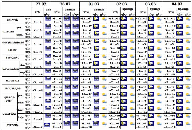 Օդի ջերմաստիճանը փետրվարի 27-ի և 28-ի ցերեկն աստիճանաբար կնվազի 8-10, մարտի 1-ի և 2-ի գիշերը՝ 7-8 աստիճանով: