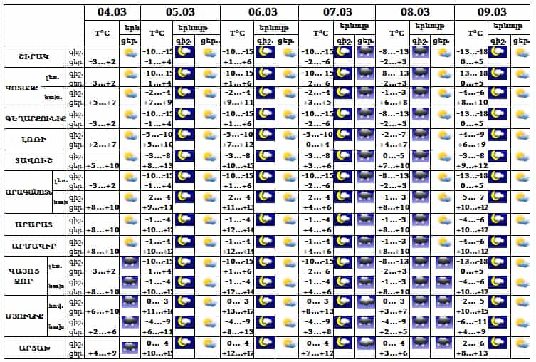 Հանրապետության տարածքում` մարտի 4-ի և 8-ի ցերեկը Վայոց ձորում, Սյունիքում և Արցախում, 7-ի ցերեկը, 8-ի գիշերը շրջանների զգալի մասում սպասվում են տեղումներ, լեռնային և նախալեռնային շրջաններում` ձյան, հովտային շրջաններում` թաց ձյան և ձնախառն անձրևի տեսքով: Մարտի 5-6-ը, 7-ի գիշերը, 9-ին սպասվում է առանց տեղումների եղանակ: Այս մասին հայտնում են ԱԻՆ-ից: