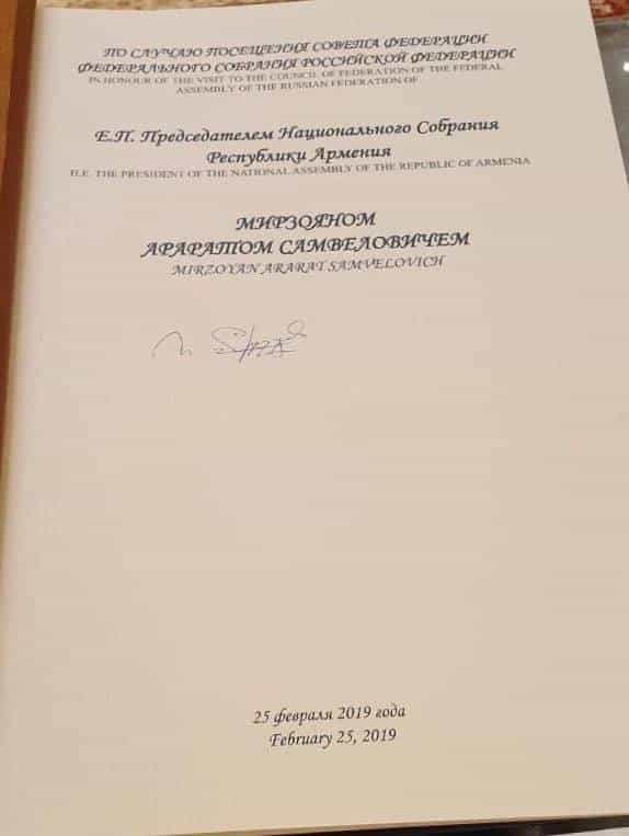 Որքան է եղել ռուսական կողմի զարմանքը, որ Միրզոյանն այդ թղթի վրա պարզապես իր ստորագրությունն է դրել: Նա երևի չի հասկացել, որ պետք է գրառում կատարի, իսկ դա նշանակում է, որ արարողակարգի մասին ունի զրո պատկերացում: Կամ էլ Միրզոյանը չի կողմնորոշվել, թե ինչ պետք է գրի ու ստիպված միայն ստորագրել է: