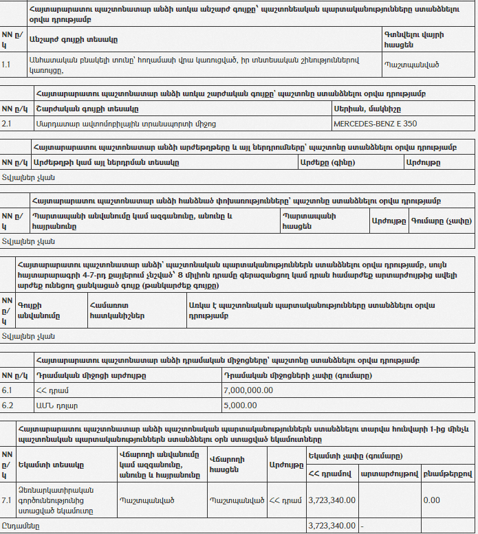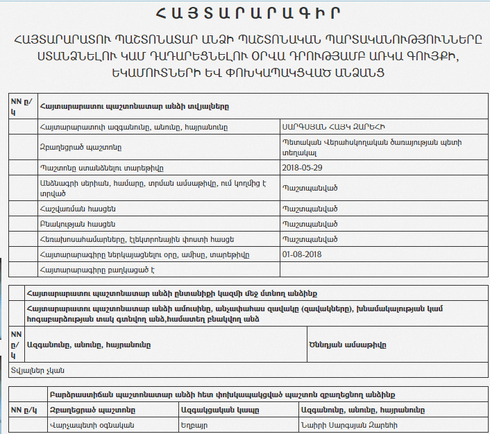Ուսումնասիրելով ՀՀ բարձրաստիճան պաշտոնատար անձանց էթիկայի հանձնաժոողովի պաշտոնական կայքում 2018 թ.-ի օգոստոսի 1-ին ՊՎԾ պետի տեղակալի պաշտոնում Հայկ Սարգսյանի ներկայացրած հայտարարագիրը՝ տեսնում ենք, որ Սարգսյանը չի ներկայացրել ժամացույցի առակայությունը այն դեպքում, երբ պետական պաշտոնյաները պարտավոր են հայտարարագրել 8 մլն դրամը գերազանցող ցանկացած ունեցվածք: