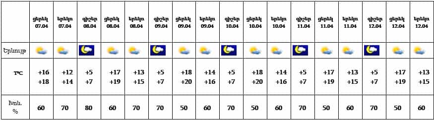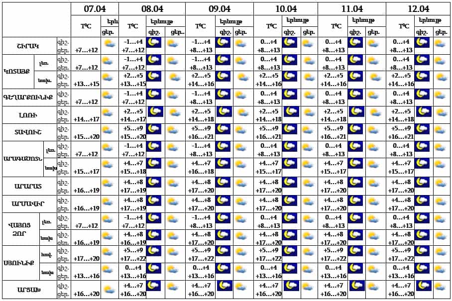 Հայաստանի տարածքում ապրիլի 8-12-ը սպասվում է առանց տեղումների եղանակ: Արտակարգ իրավիճակների նախարարության հաղորդագրության համաձայն՝ օդի ջերմաստիճանն ապրիլի 7-9-ը աստիճանաբար կբարձրանա 8-10 աստիճանով։