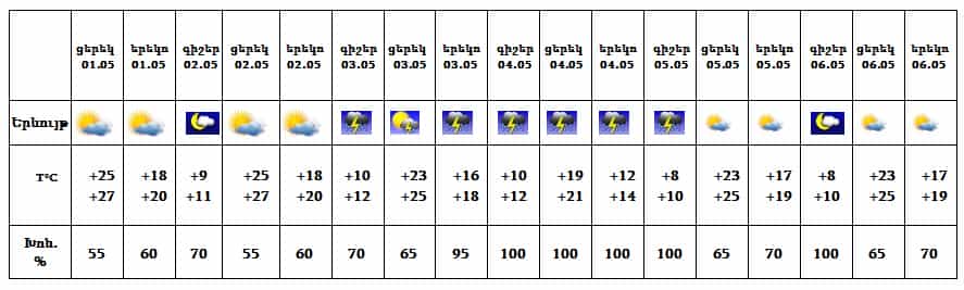 Մայիսի 3-4-ը, 5-ի գիշերը ժամանակ առ ժամանակ սպասվում են անձրև և ամպրոպ, ամպրոպների ժամանակ քամու ուժգնացում՝ 17-20 մ/վ։