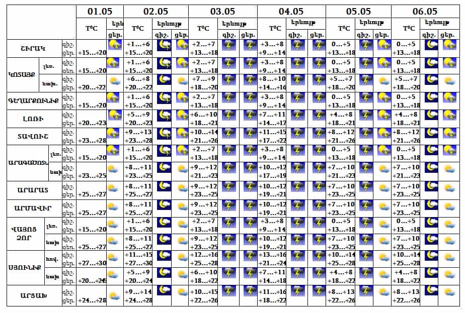 Օդի ջերմաստիճանը մայիսի 1-ին կբարձրանա 2-3, իսկ 3-4-ը ցերեկը կնվազի 5-6 աստիճանով։