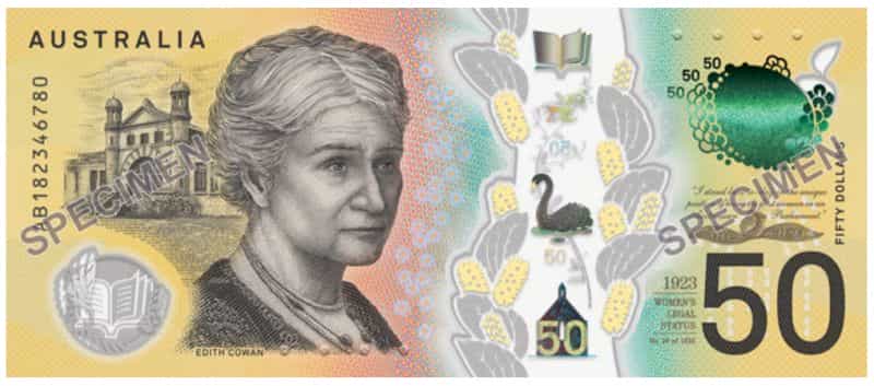 Թղթադրամի վրա պատկերված է Էդիթ Քոուանը՝ Ավստրալիայի խորհրդարանի առաջին կին անդամը, իսկ հետևի ֆոնին խորհրդարանում նրա արտասանած առաջին ճառից մեջբերում է արված: