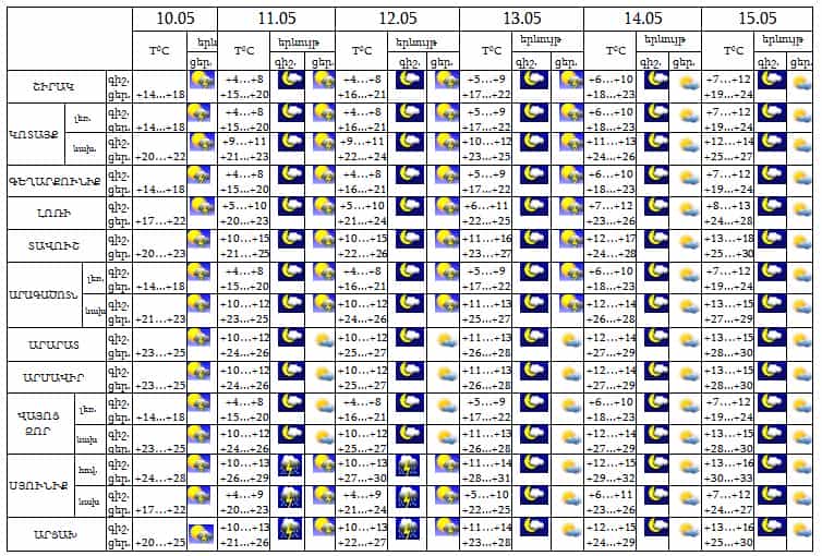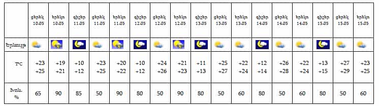 Երևան քաղաքում՝ մայիսի 10-12-ի կեսօրից հետո քաղաքի առանձին հատվածներում սպասվում է կարճատև անձրև և ամպրոպ, 13-15-ը սպասվում է առանց տեղումների եղանակ: