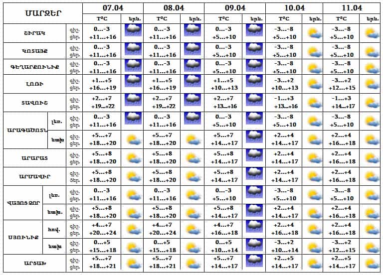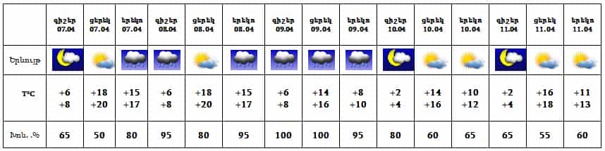 Ապրիլի 7-8-ը` երեկոյան ժամերին, հնարավոր է անձրև, 9-ին սպասվում է անձրև, 10-11-ը սպասվում է առանց տեղումների եղանակ: