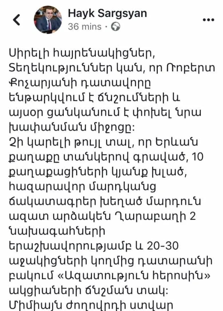 «Այսօր առավոտյան ՀՀ ԱԺ իշխող խմբակցության պատգամավորը հրապարակավ մտահոգիչ տեղեկություն է հայտնել այն մասին, որ հանրային մեծ հնչեղություն ունեցող գործ քննող դատավորը «ենթարկվում է ճնշումների»՝ որպես դրան արձագանք՝ փաստացի նախաձեռնելով հավաք դատարանի վարչական շենքի առջև։