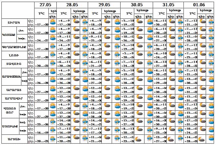 Մայիսի 28-31-ը, հունիսի 1-ի կեսօրից հետո առանձին շրջաններում սպասվում է կարճատև անձրև և ամպրոպ, առանձին հատվածներում հնարավոր է կարկուտ: Քամին՝ հարավ-արևմտյան` 3-8 մ/վ, ամպրոպի ժամանակ առանձին հատվածներում սպասվում է քամու ուժգնացում` 18-20 մ/վ: Օդի ջերմաստիճանը մայիսի 29-ից հունիսի 1-ն աստիճանաբար կբարձրանա 3-4 աստիճանով։
