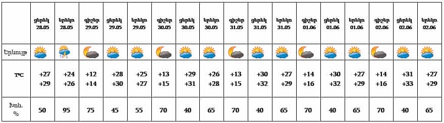 Մայիսի 29-31-ը, հունիսի 1-2-ը՝ կեսօրից հետո, առանձին շրջաններում սպասվում է կարճատև անձրև և ամպրոպ, առանձին հատվածներում հնարավոր է կարկուտ: