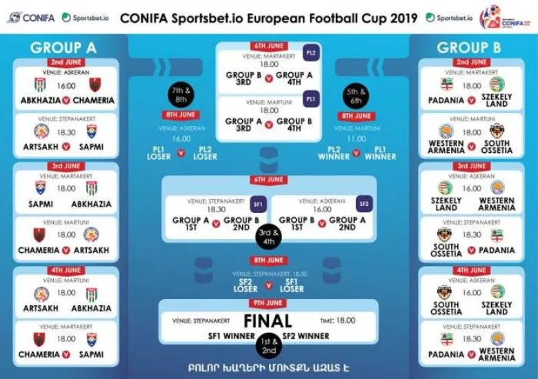 Արցախում կայանալիք չճանաչված երկրների Եվրոպայի ֆուտբոլային առաջնության (CONIFA Sportsbet.io European Football Cup 2019) կազմկոմիտեն ներկայացրել է մրցաշարի խաղացանկը։ Ութ թիմեր բաժանվել են երկու խմբի։