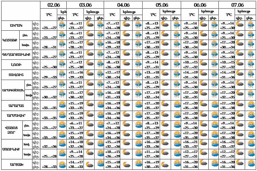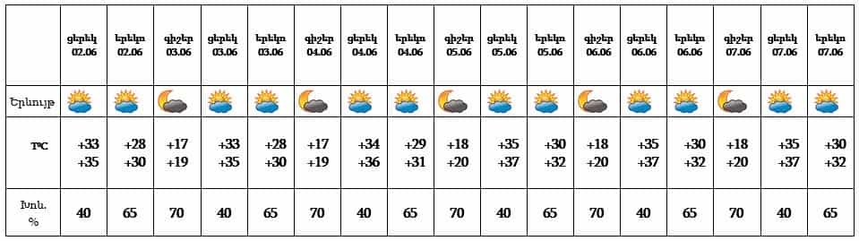 Հունիսի 2-7-ն առանձին շրջաններում կեսօրից հետո սպասվում է կարճատև անձրև և ամպրոպ: Քամին՝ հարավ-արևելյան՝ 3-8 մ/վ:
