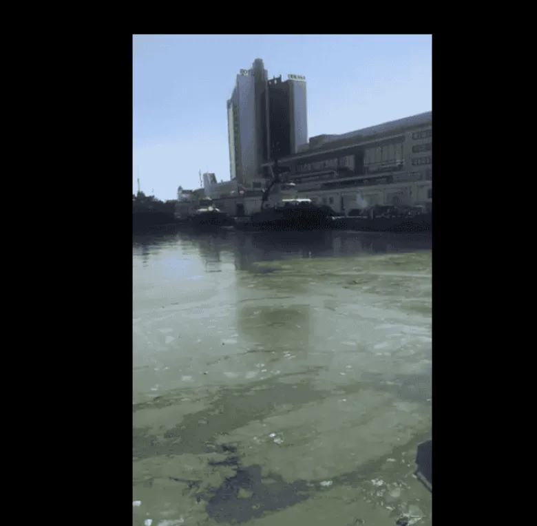 Հաղորդավարը ցույց է տալիս թե ինչպես է ծովը «ծաղկել» ջրիմուռների կենսագործունեության հետևանքով: Նրա խոսքով` մինչև անգամ դելֆիններ են սատկել: