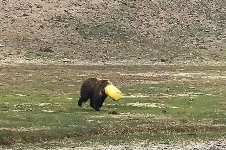 Ինչպես նշում է Daily Mail-ը, կենդանին, հավանաբար, գորշ արջ է կամ գորշ արջի որևէ ենթատեսակ: Այն ենթադրաբար գլուխը մտցրել է դեղին դույլի մեջ՝ ուտելիք որոնելու, իսկ հետո չի կարողացել ազատվել դրանից: