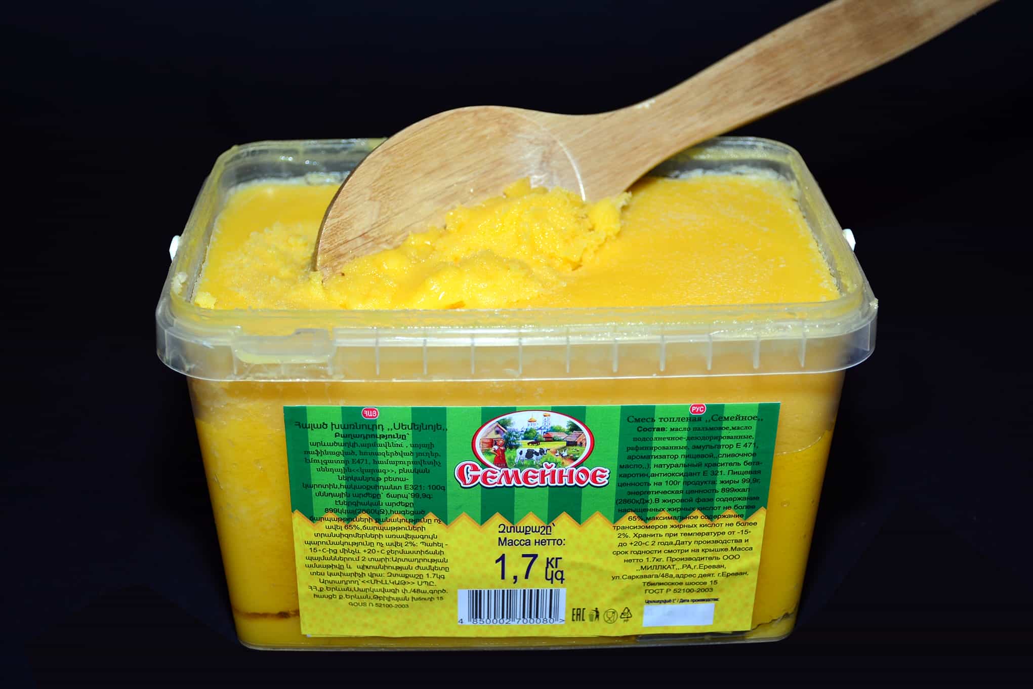 «Семейное» ապրանքանիշի նորույթը՝ հալած բուսական յուղերի խառնուրդը, կարող եք ձեռք բերել հարմարավետ պլաստիկե տարաներով, որոնք ապահովում են պրոդուկտի համային հատկանիշների երկար պահպանելիությունը. «Մենք ներկայացնում ենք 1.7 կգ.-ոց, 2.8 կգ.-ոց, 5 կգ.-ոց և 10կգ.-ոց տարաներով բուսական յուղերի խառնուրդ: Այս չափերը և այս տարաներն ընտրելիս մենք հաշվի ենք առել մեր սպառողների պահաջմունքները: Դրանք հարմար են oգտագործման տեսանկյունից և հերմետիկ փակվում են»,- նշում է «Семейное» ապրանքանիշի Որակի Վերահսկողության բաժնի ղեկավար Հասմիկ Թարզյանը: