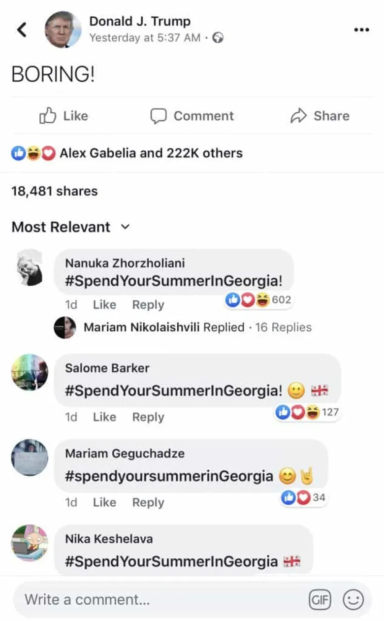 Տարածված #SpendyoursummerinGeorgia հեշթեգն օգտատերերը թողել են նաև ԱՄՆ նախագահ Դոնալդ Թրամփի Boring թվիթի մեկնաբանություններում, որում նա գրել է դեմոկրատների դեբատների մասին իր տպավորությունը: