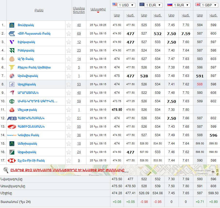 Ներկայացնում ենք Հայաստանի բանկերի կողմից գնվող և վաճառվող արտարժույթների փոխարժեքներ հուլիսի 25-ի դրությամբ՝ ըստ rate.am-ի: