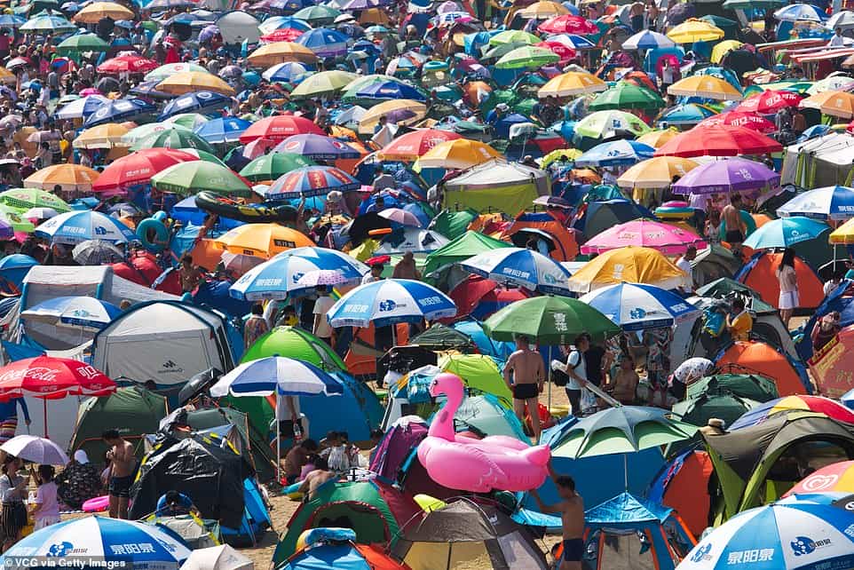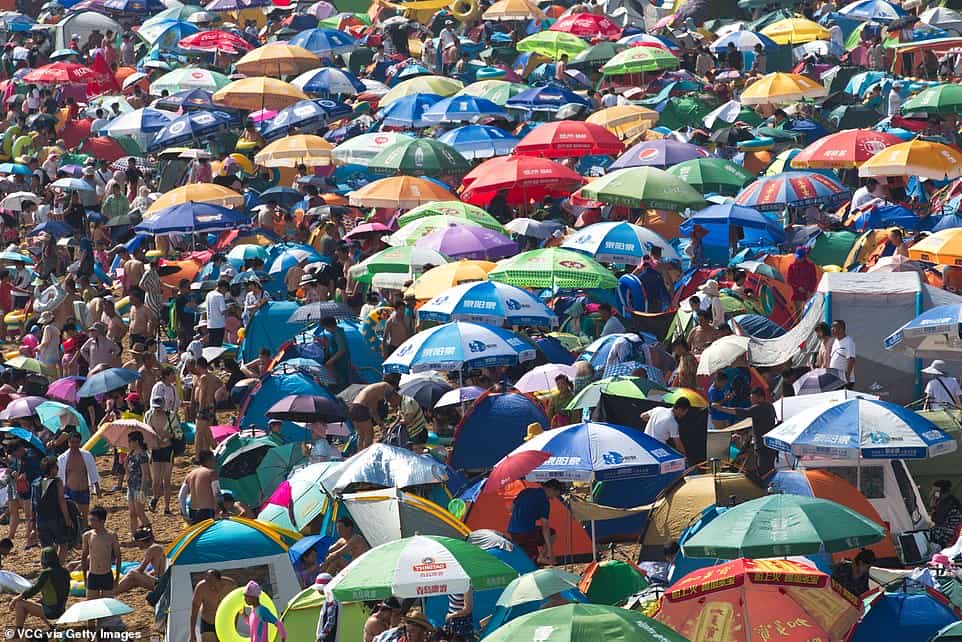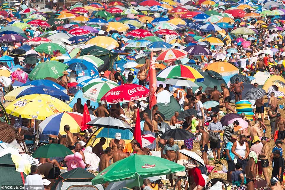 Կիրակի Ֆուձիաժուան ծովափնյա հանգստավայրում արված լուսանկարներում երևում է, թե ինչպես են տասնյակ հազարավոր այցելուներ «հեղեղել» լողափը. նրանց թվում կան ինչպես մեծահասակներ, այնպես էլ երեխաներ ու ծերեր: Լուսանկարներում երևում է, որ այցելուներից շատերը հսկայական հովանոցներով են, ինչն է՛լ ավելի է դժվարացրել մարդկանց տեղաշարժը:
