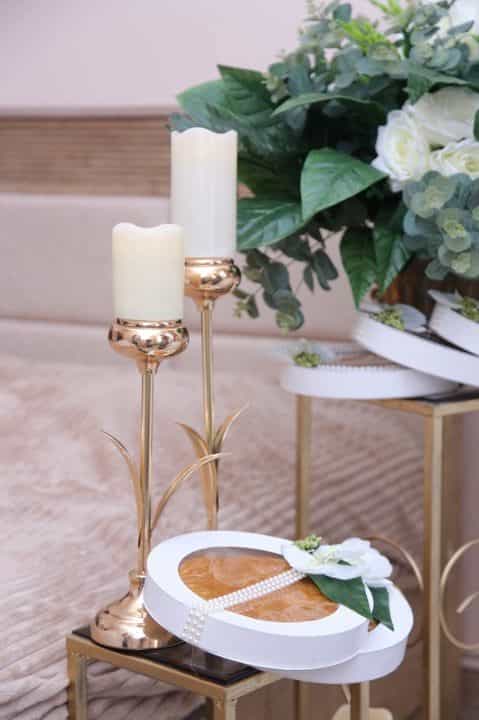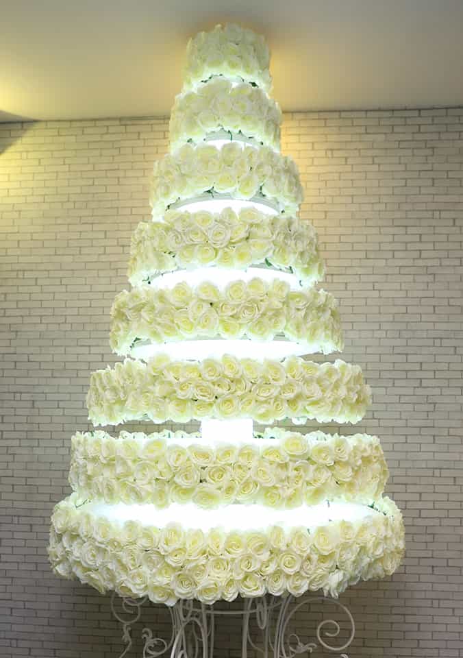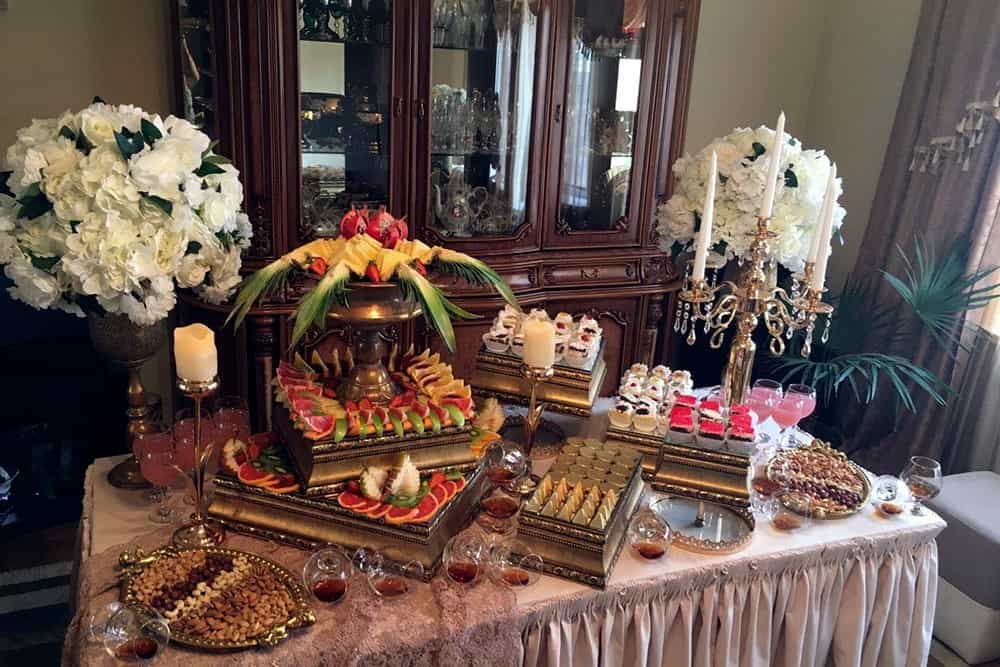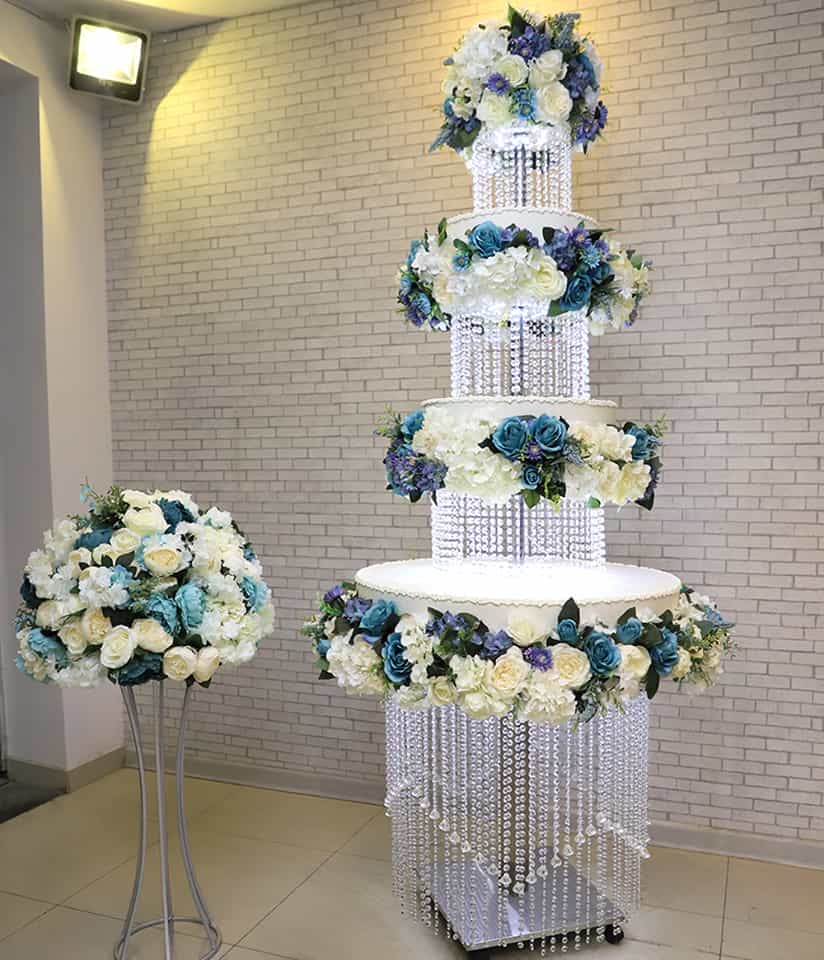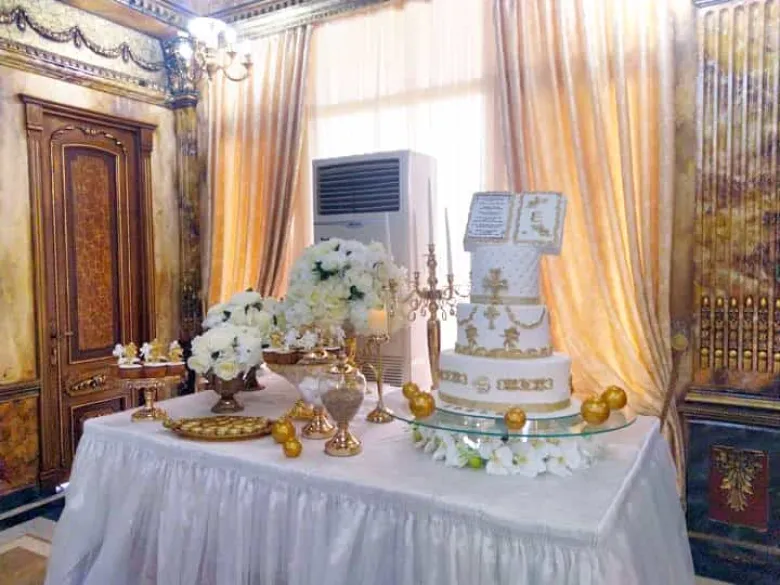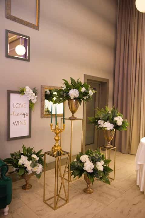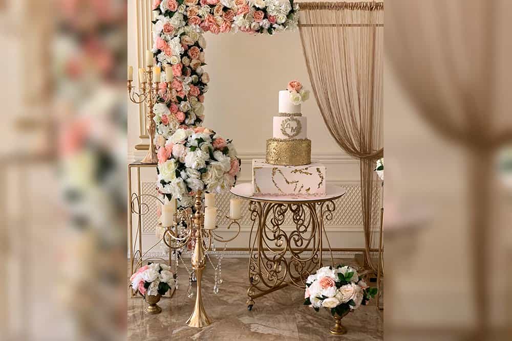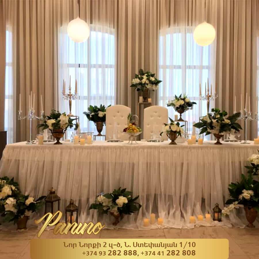 Սրահ՝ ձևավորված նուրբ ծաղիկներով, որոնց ինքնատիպ ձևավորումն ու գունային ընտրությունը լրացնում են կենտրոնում իր հատուկ տեղը զբաղեցրած շքեղ տորթին: