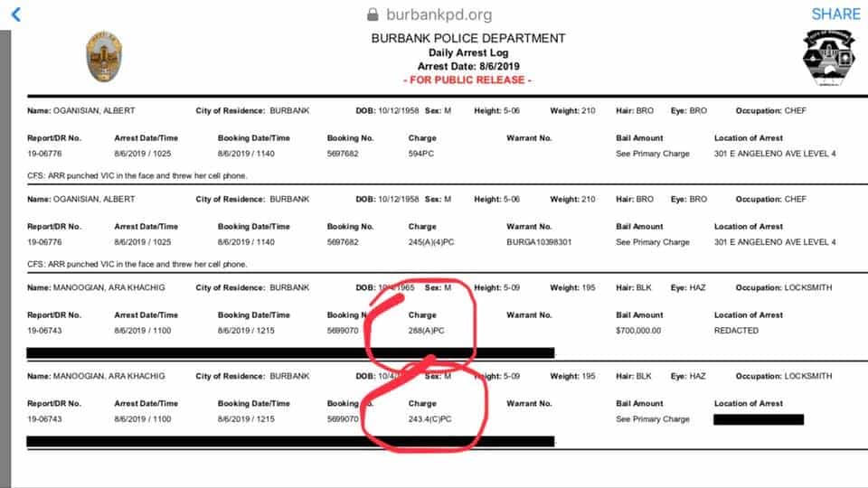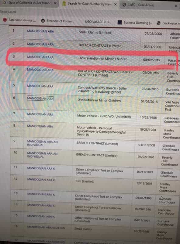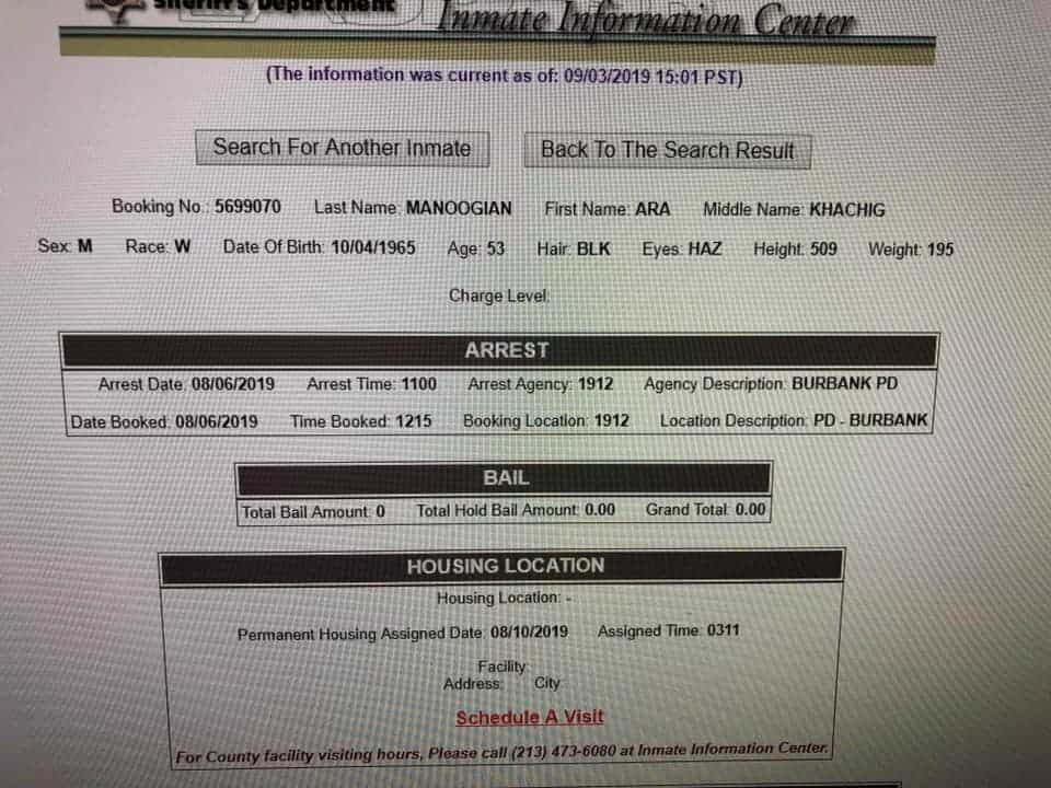 Արա Մանուկյանին 2019 թվականի օգոստոսի 6-ին մեղադրանք է առաջադրվել սեռական հանցագործության, մասնավորապես, մանկապղծության համար: Կալիֆոռնիայի քրեական օրենսգրքի համաձայն՝ մեղադրանքը վերաբերում է մինչև 14 տարեկան անչափահասների հետ անառակաբարո գործողություններ կատարելուն: