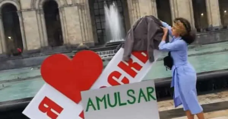Ամուլսարի հանքի շահագործման դեմ պայքարող ակտիվիստ Շողակաթ Վարդանյանը փոքրիկ ակցիա է իրականացրել` փակելով Հանրապետության հրապարակում տեղադրված «Ես սիրում եմ Մոսկվա» ցուցանակի գրությունը: