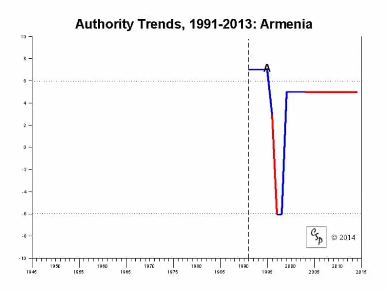ԱՄՆ Մերիլանդի համալսարանի գիտնականների խմբի մշակած polity index գրաֆիկում երևում է ժողովրդավարության և մարդու իրավունքների վիճակը Հայաստանում անկախության 24 տարիներին՝ մինչև 2013թ.։ Հետազոտությունը ներառում է աշխարհի բոլոր երկրները, ուր մի ծայրում -10-ն է` ամենաբռնատիրականը, որ ունի, օրինակ, Հյուսիսային Կորեան, մյուս ծայրում +10-ն է` ամենաժողովրդավարականը, որտեղ Շվեյցարիան է։ Հայաստանը անկախանալուց կարճ ժամանակ անց, Տեր-Պետրոսյանի նախագահության տարիներին կտրուկ անկում է ապրել մինչև -6՝ հասել դեպի բռնապետություն, և միայն Տեր֊Պետրոյանի տապալումից ու Քոչարյանի իշխանության գալուց հետո` 1998-1999-ից սկսած, 9 կետով բարձրացել է։