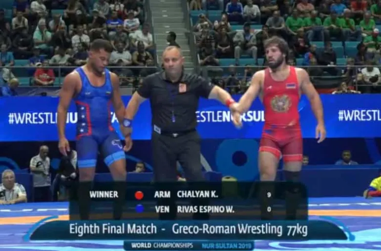 77 կգ քաշային կարգում հունահռոմեական ոճի ըմբիշ Կարապետ Չալյանը վստահ առաջ է շարժվում Ղազախստանի մայրաքաղաք Նուր-Սուլթանում շարունակվող ըմբշամարտի աշխարհի առաջնությունում։