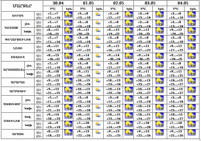 Ապրիլի 30-ին, մայիսի 2-4-ը՝ գիշերը և կեսօրից հետո շրջանների մեծ մասում սպասվում է անձրև և ամպրոպ, առանձին վայրերում հնարավոր է կարկուտ: Մայիսի 1-ին սպասվում է առանց տեղումների եղանակ: