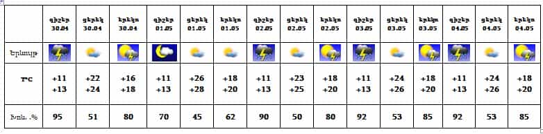 Ապրիլի 30-ին, մայիսի 2-4-ը՝ գիշերը և կեսօրից հետո սպասվում է անձրև և ամպրոպ, ամպրոպի ժամանակ սպասվում է քամու ուժգնացում՝ 15-18մ/վ: Մայիսի 1-ին սպասվում է առանց տեղումների եղանակ: