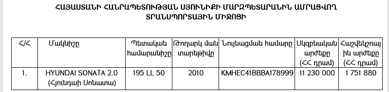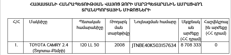 26,5 մլն արժողությամբ մեքենա կհատկացվի Պետգույքի կառավարման կոմիտեին