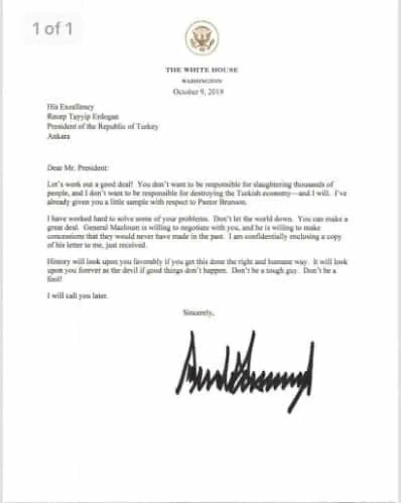ԱՄՆ նախագահն իր նամակում Էրդողանին ասել է, որ «պատմությունը նրա հանդեպ բարեհաճ կլինի», եթե Թուրքիայի նախագահը մարդասիրաբար վարվի, բայց նա դրանում կմնա որպես «հրեշ», «եթե լավ բան տեղի չունենա»: