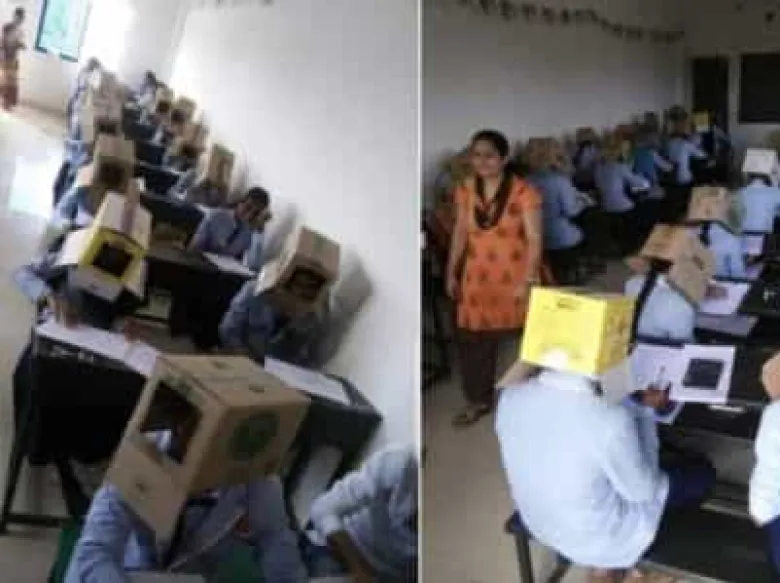 Լուսանկարում ուսանողները նստարաններին նստած են՝ գլխներին թտվարաթղթե տուփերով, որ միմյանցից արտագրելու հնարավորություն չունենան: