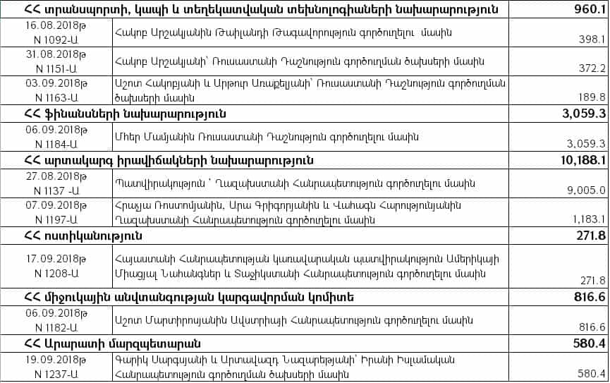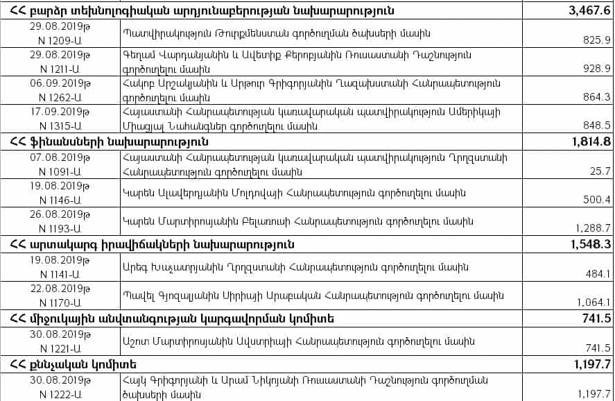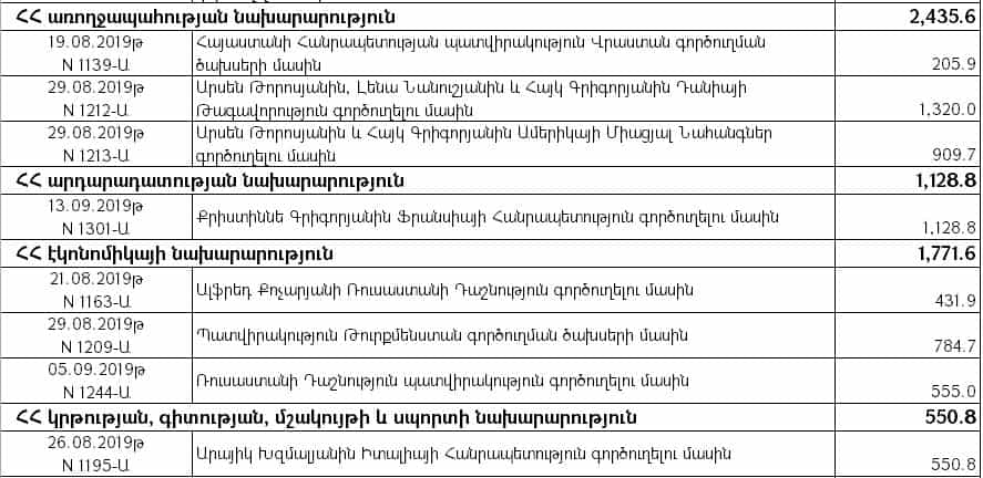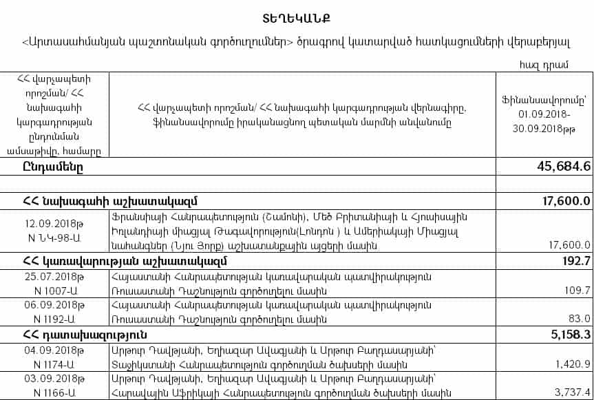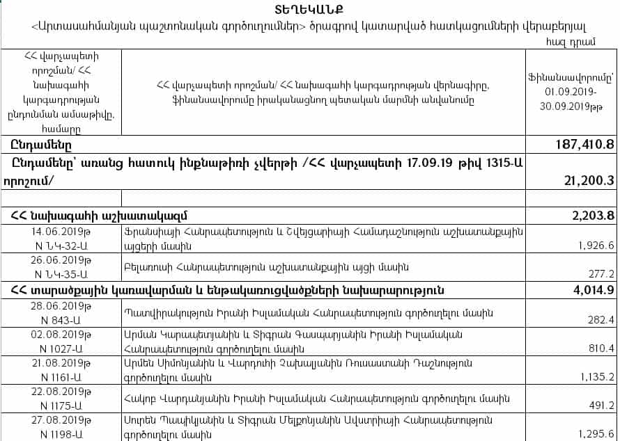 «Արտասահմանյան պաշտոնական գործուղումներ» ծրագրով նախատեսված միջոցների հաշվին կատարված ֆինանսավորմամբ կառավարության անդամների գործուղումների համար 2019 թվականի սեպտեմբեր ամսին ծախսվել է 187 մլն 410 հազար դրամ, ինչը 2018-ի նույն ժամանակահատվածի համեմատ ավելի է շուրջ 142 մլն-ով, կամ 410 %-ով (45 մլն 684 հազար դրամ), իսկ 2017-ի սեպտեմբերի համեմատ 161 մլն-ով կամ 603 %-ով (26 մլն 641 հազար դրամ):