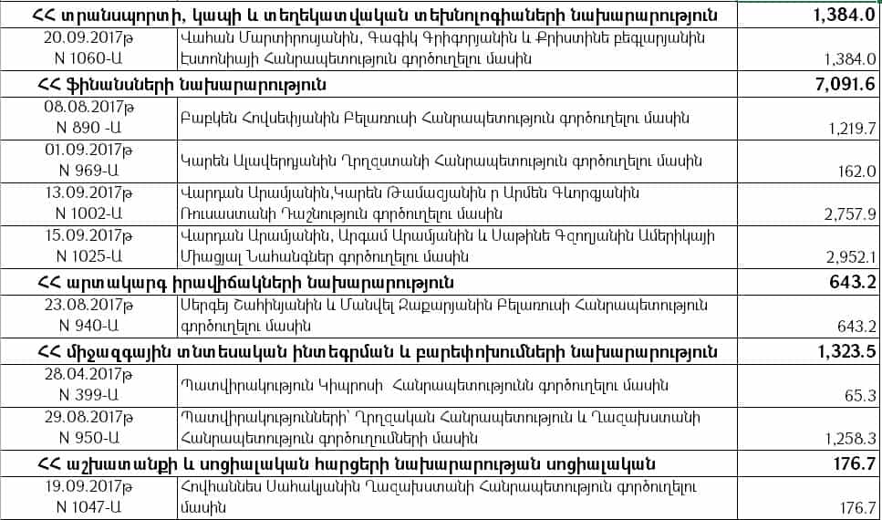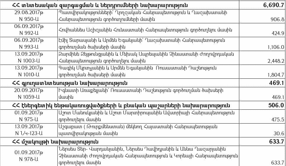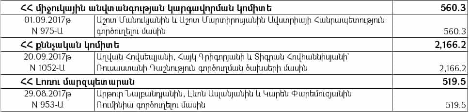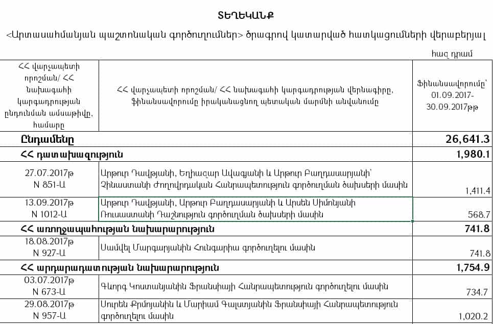 Նախարարությունից Tert.am-ին են տրամադրել 2017, 2018 և 2019 թվականների պետական բյուջեներով «Արտասահմանյան պաշտոնական գործուղումներ» ծրագրով նախատեսված միջոցների հաշվին՝ այդ տարիների սեպտեմբեր ամիսներին կատարված ֆինանսավորումը՝ ըստ համապատասխան մարմինների և որոշումների, ինչը ներկայացնում ենք կից: