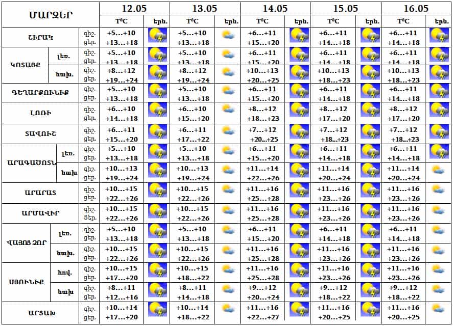 Մայիսի 12-ին և 14-ին, 15-ին շրջանների զգալի մասում, 16-ին՝ հատկապես գիշերը և կեսօրից հետո, հյուսիսային շրջաններում սպասվում է կարճատև անձրև և ամպրոպ, առանձին վայրերում հնարավոր է կարկուտ: