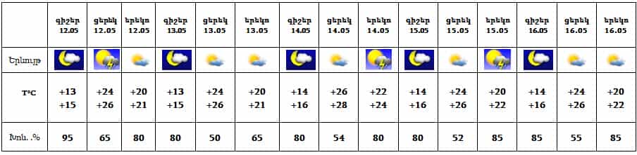 Մայիսի 12-ին, 14-ին, 15-ին՝ հատկապես գիշերը և կեսօրից հետո, սպասվում է կարճատև անձրև և ամպրոպ, ամպրոպի ժամանակ սպասվում է քամու ուժգնացում՝ 15-18 մ/վ: 13-ին և 16-ին սպասվում է առանց տեղումների եղանակ: