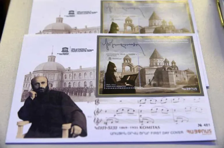 Մայր Աթոռ Սուրբ Էջմիածնում դեկտեմբերի 1-ին մարվեց և շրջանառության մեջ դրվեց նամականիշով գեղաթերթիկ՝ նվիրված «Մեծանուն հայեր. Կոմիտասի ծննդյան 150-ամյակը» թեմային: Այս մասին տեղեկացնում է ՀՀ բարձր տեխնոարդյունաբերության նախարարությունը: