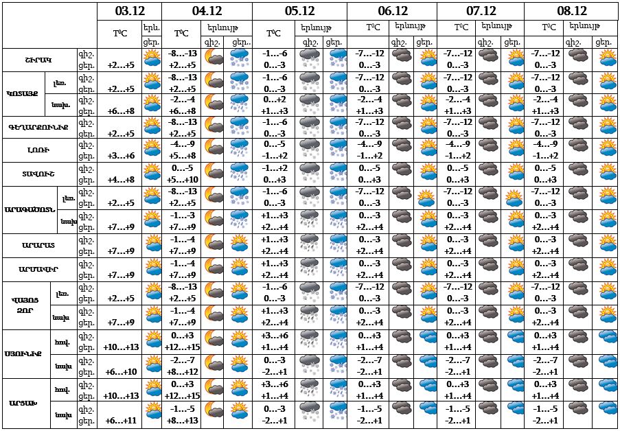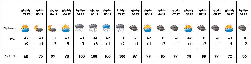 Երևան քաղաքում՝ դեկտեմբերի 3-ի ցերեկը, 6-8-ը սպասվում է առանց տեղումների եղանակ, 4-ի երեկոյան ժամերին, 5-ին սպասվում են տեղումներ։