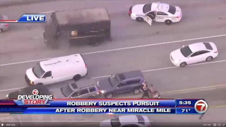 Երկու տղամարդ փորձել է թալանել Կորալ Գեյբլս քաղաքում գտնվող խանութը, սակայն աշխատակիցները հասցրել են զանգահարել ոստիկանություն: Որպեսզի խուսափեն հետապնդումից, հանցագործներն առևանգել են առաքման ծառայության մեքենան՝ վարորդին պատանդ վերցնելով: