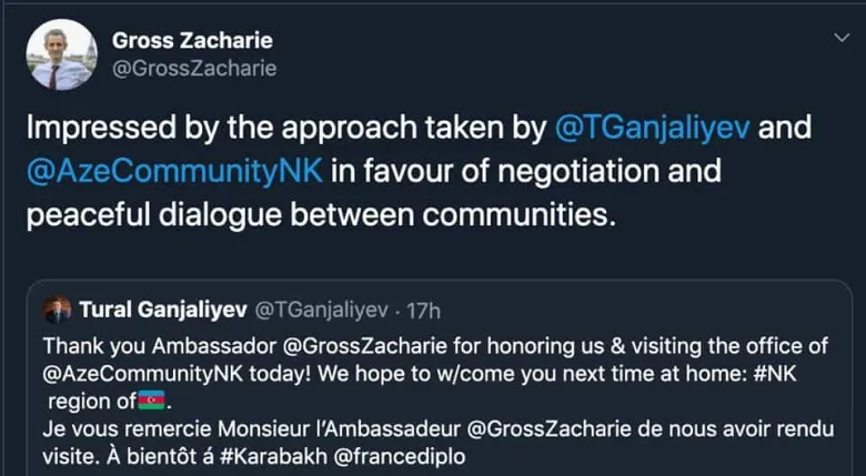 Ադրբեջանում Ֆրանսիայի դեսպանը իր թվիթերի էջում ողջունել է, այսպես կոչված, «Լեռնային Ղարաբաղի ադրբեջանական համայնքի ղեկավարի» գրառումը, որտեղ վերջինս հույս է հայտնել, որ նրանց մյուս հանդիպումը կկայանա «Ադրբեջանի` Լեռնային Ղարաբաղի շրջանում»: