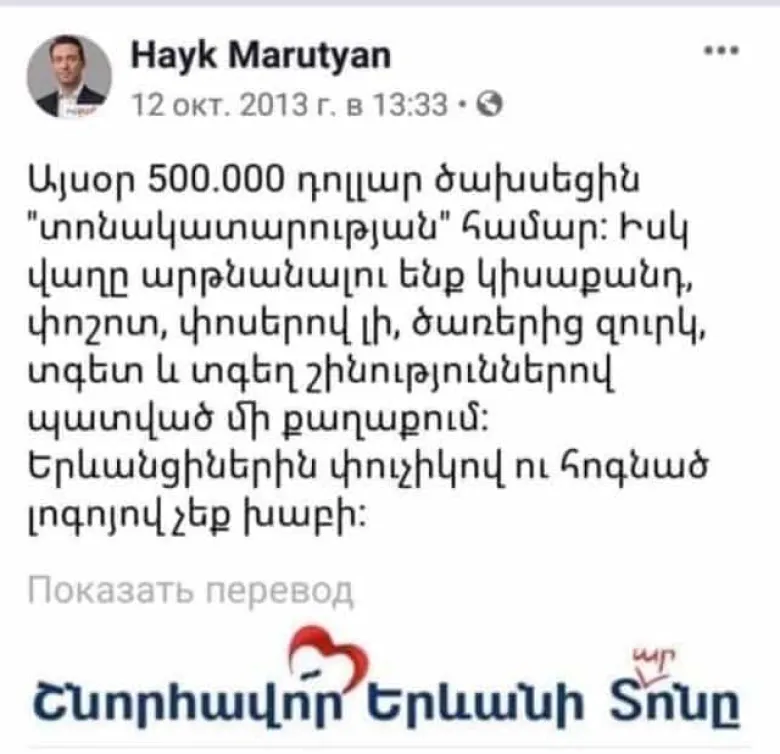 «Այսօր 500.000 դոլլար ծախսեցին «տոնակատարության» համար: Իսկ վաղը արթնանալու ենք կիսաքանդ, փոշոտ, փոսերով լի, ծառերից զուրկ, տգետ և տգեղ շինություններով պատված մի քաղաքում: Երևանցիներին փուչիկով ու հոգնած լոգոյով չեք խաբի»,- ասված է Հայկ Մարությանի 2013թ. գրառման մեջ, որով վերջինս մեղադրում էր Տարոն Մարգարյանին և քաղաքային իշխանություններին: