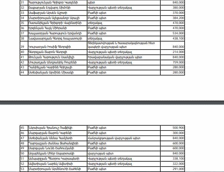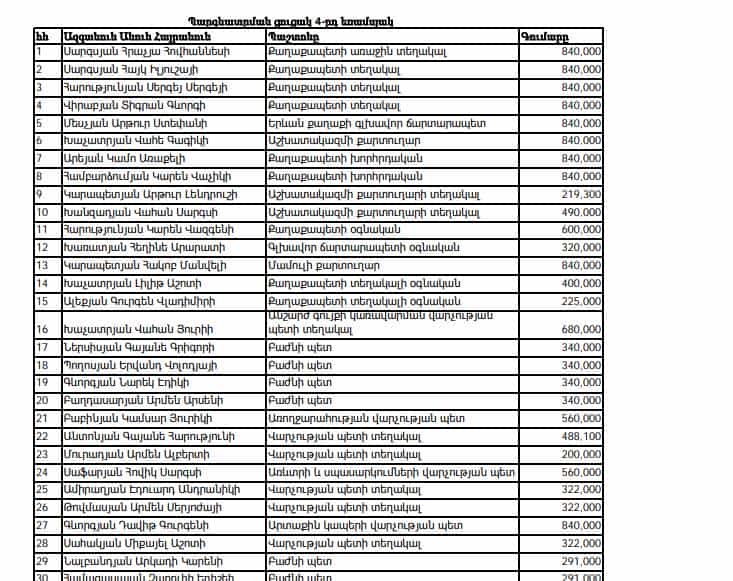 Սակայն պարզվում է այս ամիս էլ են նույն աշխատակիցները պարգևատրվել եւ պատկառելի չափերով: Օրինակ, Երևանի քաղաքապետի տեղակալները, ովքեր անցած ամիս պարգևատրվել էին 420 հազար ՀՀ դրամով, այս ամիս պարգևատրվել են 840 հազար ՀՀ դրամով։ Քաղաքապետարանի աշխատակազմի քարտուղար Վահե Խաչատրյանը, գլխավոր ճարտարապետը, քաղաքապետի երկու խորհրդականները, մամուլի քարտուղարը, որի հիմնական գործառույթը մամուլի աշխատանքը խոչընդոտելն է, տեղեկատվության վարչության պետը, մի շարք այլ վարչությունների պետեր ևս պարգևատրվել են 840 հազար դրամով, բաժնի պետերը 600 հազար դրամի կարգի եւ այլն: