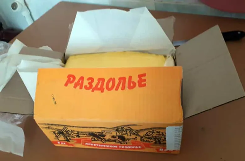 Կրկնապիտակի տակ առկա մասամբ ջնջված մակնշման հետքերի վերծանումից պարզվել է, որ տվյալ տուփի պարունակությունը Ռուսաստանի Դաշնության «ДМФ» կազմակերպության կողմից արտադրված է բուսակաթնային արտադրանք է՝ «Սփրեդ»:
