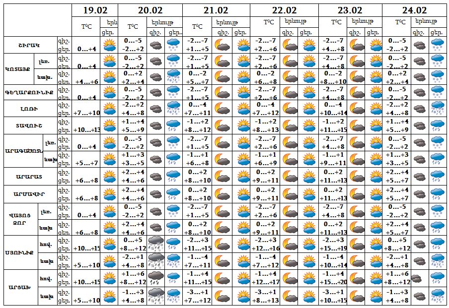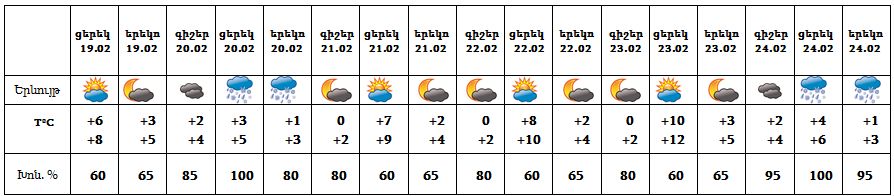 Երևան քաղաքում՝ փետրվարի 19-ի ցերեկը, 20-ի և 24-ի գիշերը, 21-23-ը սպասվում է առանց տեղումների եղանակ։ Փետրվարի 20-ի և 24-ի ցերեկը սպասվում են տեղումներ, բարձրադիր գոտում՝ թաց ձյան, ցածրադիր գոտում` անձրևի տեսքով: