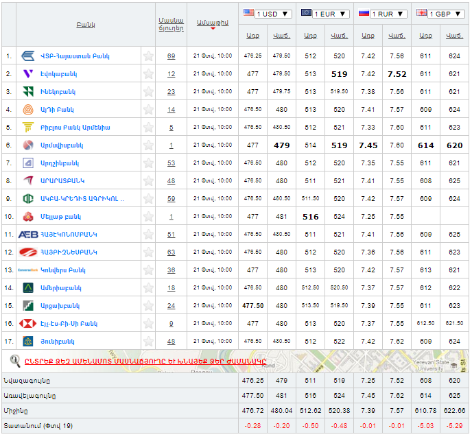 Ամերիկյան մեկ դոլարը գնվում է 476.25 դրամ նվազագույն և 477.50 դրամ առավելագույն փոխարժեքով, վաճառվում՝ 479 դրամ նվազագույն և 481 դրամ առավելագույն փոխարժեքով: