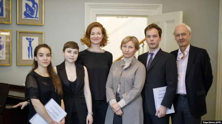 Մեծ Բրիտանիա-Կոմպոզիտոր Էնթոնի Բոլթոնը, Օլիվիա Ռեյը, ով խաղում է Աննա Պոլիտկովսկայայի դերը, Մարինա Լիտվինենկոն՝ սպանված ռուս նախկին հետախույզ Ալեքսանդր Լիտվինենկոյի այրին և երաժիշտները, Լոնդոն, 24 փետրվարի, 2020թ.